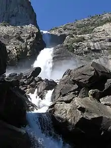Wapama Falls is the larger of two waterfalls located on the northern wall of Hetch Hetchy Valley below Hetch Hetchy Dome, in Yosemite National Park. It flows almost year-round and during peak flow has been known to inundate the trail bridge crossing its base, making the falls impossible to pass. The falls consist of two primary drops angled roughly 60 degrees to each other, and a broad cascade at its base.