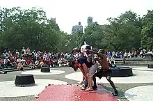 The presence of street performers has been one of the defining characteristics of Washington Square Park.[29] For many years, people visiting the park have mingled with the buskers, performers, musicians, and poets.[30] Because of a change in policy on a 2010 rule that involved artists, the new ruling that was to come in on May 8, 2013, would involve entertainers. This could mean that performers could be fined $250 for the first offense and up to $1,000 for further violations. The 2010 rule on which the 2013 ruling was based stated that artists could not sell within 50 feet of a monument or five feet from any bench or fence.[29]