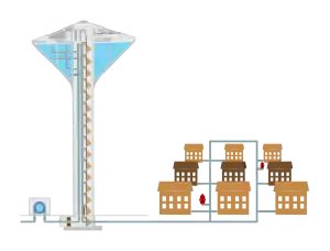 - Water tower (also known as elevated surface reservoir): An elevated water tank. A few common types are spheroid elevated storage tank, a steel spheroid tank on top of a small-diameter steel column; composite elevated storage tank, a steel tank on a large-diameter concrete column; and hydropillar elevated storage tanks, a steel tank on a large-diameter steel column. The space within the large column below the water tank can be used for other purposes such as multi-story office space and storage space. A main concern for using water towers in the water distribution system is the aesthetic of the area.[11][12]