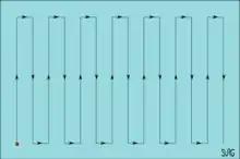 Search patterns are methods for systematically travelling over the surface of the area of water in which the target is likely to be found, while observers and/or instruments are deployed with the intention of detecting the targets of the search. An effective search pattern is one in which the entire surface can be examined with a good chance of detecting the target if it is present, but without excessive overlap, though some overlap is usually considered advisable to allow for inaccurate estimates of target visibility and sea and atmospheric conditions. Several standardised search patterns are in common use, some of which are more suitable for surface vessels, and others are more suitable for aircraft. Similar search patterns are used for underwater searches. Most water surface search patterns are followed relative to a moving datum, so steering is by compass heading and distance is determined by speed through the water and elapsed time. Speed and direction over the ground will vary according to drift.[2]