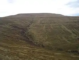 Waun Fach is, with a summit height of 811 metres (2,661 ft), the highest mountain in the Black Mountains in south-eastern Wales. It is one of the three Marilyns over 600 m that make up the range, the others being Black Mountain and Mynydd Troed. To the north Rhos Fawr and the Radnor Forest can be seen. It is the third highest mountain in Britain south of Snowdonia (after Pen y Fan and its near neighbour Corn Du). It is situated at the head of the Grwyne Fechan valley, above and to the west of the Grwyne Fawr reservoir.[1] It has an undistinguished (and almost indistinguishable[2]) rounded summit.[3] The nearby tops on the ridge, Pen Trumau and Pen y Gadair Fawr,[4] although lower, are very much more recognisable.[5]