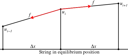 Here the dependent variable u(x) measures the distance from the equilibrium of the mass situated at x, so that u(x) essentially measures the magnitude of a disturbance (i.e. strain) that is traveling in an elastic material. The forces exerted on the mass m at the location x + h are: