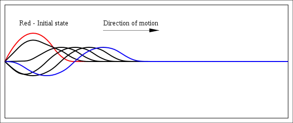 The red curve is the initial state at time zero, at which the string is "let free" in a predefined shape[11] with all . The blue curve is the state at time i.e. after a time that corresponds to the time a wave that is moving with the nominal wave velocity c = √f/ρ would need for one fourth of the length of the string.