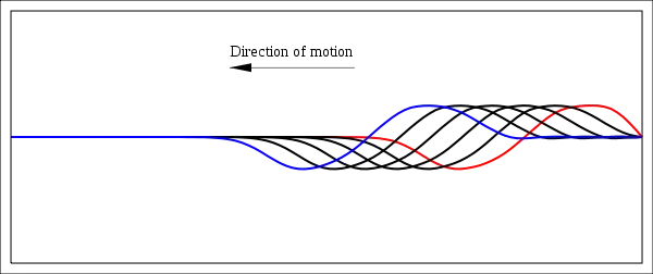 The wave now travels towards left, and the constraints at the end points are not active any more. When finally the other extreme of the string is reached, the direction will again be reversed in a way similar to what is displayed in the figure above for
