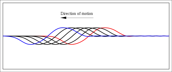 The direction of motion is reversed. The red, green and blue curves are the states at the times while the 3 black curves correspond to the states at with the wave starting to move back towards left.