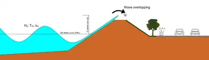When waves break over a dike, it causes water to flow onto the land behind it. Excessive overtopping is undesirable because it can compromise the integrity of the structure or result in a safety hazard, particularly when the structure is in an area where people, infrastructure or vehicles are present, such as in the case of a dike fronting an esplanade or densely populated area. Excessive overtopping may cause damage to the inner slope of the dike, potentially leading to failure and inundation of the land behind the dike, or create water-related issues on the inside of the dike due to excess water pressure and inadequate drainage. The amount of overtopping depends on factors including the freeboard, wave height, wave period, and slope of the dike.[1]