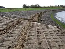 By analysing flood mark heights, which involves simply plotting the data on logarithmic paper, it is possible to directly obtain values such as the 1/500 wave run-up, and consequently the required safety height. An example of this can be observed in the accompanying photo of the run-up and flood mark lines at a dike along the Bathpolder in Zeeland. The photo shows two flood mark lines, which represent the wave run-up of two subsequent storms (on October 12, 2009, with water levels at 2.2m and 1.9m above mean sea level) in the Bathpolder. In the foreground, there is a slope with Haringman blocks, while the background features a slope of Elastocoast. The wave height during these storms was approximately 0.5m. The wave run-up was 0.8 and 0.85m above the storm surge level on the Elastocoast, and 1.05 and 1.1m above the storm surge level on the Haringman blocks. The slope gradient here is 1:4.2. As a Haringman block measures exactly 50cm, the run-up can be assessed in this photo. Subsequent analysis reveals that the reduction coefficient γf for Haringman blocks here is 1.0, and for Elastocoast, it is 0.8.