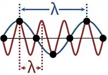 In physics and mathematics, wavelength or spatial period of a wave or periodic function is the distance over which the wave's shape repeats.[1][2] In other words, it is the distance between consecutive corresponding points of the same phase on the wave, such as two adjacent crests, troughs, or zero crossings. Wavelength is a characteristic of both traveling waves and standing waves, as well as other spatial wave patterns.[3][4] The inverse of the wavelength is called the spatial frequency. Wavelength is commonly designated by the Greek letter lambda (λ). The term "wavelength" is also sometimes applied to modulated waves, and to the sinusoidal envelopes of modulated waves or waves formed by interference of several sinusoids.[5]