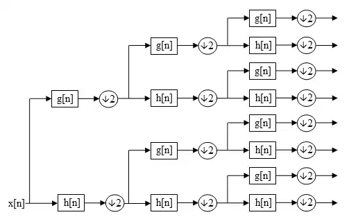 In the DWT, each level is calculated by passing only the previous wavelet approximation coefficients (cAj) through discrete-time low- and high-pass quadrature mirror filters.[1][2] However, in the WPD, both the detail (cDj (in the 1-D case), cHj, cVj, cDj (in the 2-D case)) and approximation coefficients are decomposed to create the full binary tree.[3][2][4][5][6][7]