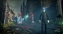 Lightbearer: The second DLC story that follows Wellington Wells' local rock superstar, Nick Lightbearer (real name Norbert Pickles) who wakes one morning in his hotel room hallucinating about a talking rat with the voice of his ex-manager Virgil; his clothes are soaked in blood and he is unable to recall the events that led to his situation. In this DLC, Nick does not use weapons to fend off his fans (rabid Wellies and Wellettes who love him to the point of wanting a literal "piece of him"); instead, Nick dispatches them using music. Since there is no map available to guide him, he plays his guitar in front of the gilded full-body statues molded in his likeness to indicate his current destination.