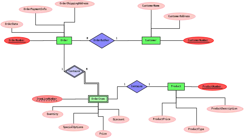 Consider a database that records customer orders, where an order is for one or more of the items that the enterprise sells. The database would contain a table identifying customers by a customer number (primary key); another identifying the products that can be sold by a product number (primary key); and it would contain a pair of tables describing orders.