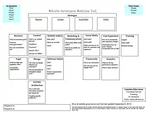 Several models of website governance exist. Authors have focused on the content lifecycle;[13] primary components, such as people, process, and standards;[14] attributes, such as accountability, accessibility, participation across business areas, and standards;[15] and type of governance structure (centralized, decentralized, or federated).[16]