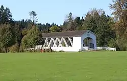 The Weddle Bridge is a 120-foot (37 m) long wooden covered bridge in Sweet Home, Oregon, United States.[4] The bridge originally spanned Thomas Creek near Scio but was replaced by a concrete bridge in 1980 and was scheduled to be destroyed in 1987. To save the bridge, local activists staged protests and persuaded former Oregon Senator Mae Yih to help save the bridge. The Oregon Legislative Assembly soon approved the Oregon Covered Bridge Program, which helped pay for covered bridge rehabilitation projects statewide. The Weddle Bridge was the first to receive grants from the program.[4]