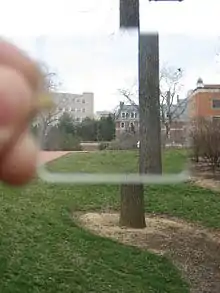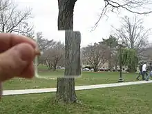 Importantly, the bottom edge of the prism must be roughly parallel to the ground in order to provide an accurate estimate on sloped ground. Wedge prisms can be difficult to use in wet conditions due to the effect water droplets have on the optical properties of the glass. Wedge prisms come in different colors such as clear or amber. The amber provides the same function as the clear wedge prism, only it reduces glare and is easier to use on overcast or cloudy days. Operating a wedge prism is one technique used in forestry today because the wedge prism is simple, relatively inexpensive, portable, and as accurate as other angle gauges when properly calibrated and used properly. One simply holds the prism directly over the plot center,[3] and by focusing on a tree, the refracted light will offset the trunk of the tree. The wedge prism is used to take measurements in both land management and in timber procurement. Other tools often used to accompany the wedge prism in taking forest inventory are clinometers, Biltmore sticks, relascopes, and diameter tapes.
