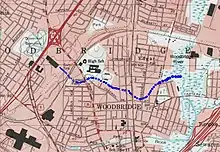 The brook arises near Woodbridge High School, flows east, and crosses Wedgewood Avenue, Amboy Avenue and Barron Avenue before entering Woodbridge River in the Woodbridge River Park. Interest in the brook has increased as it has had recurrent flooding in recent years. Woodbridge is bordered on the east by the Arthur Kill, into which the Woodbridge River flows. There is a history of tidal flooding along this river and its tributaries. Woodbridge rivers, have been described, also, as having a "high flow, flashy nature;" in addition to tidal flooding, fluvial flooding is also common. The land is relatively impervious, and flooding is exacerbated steep slopes, urban cover and outflow block. The twin culvert size at the railroad crossing just downstream from Barron Avenue is 4x4 feet; this leads to severe upstream flooding. It is estimated that a 100 year flood will put the area under nine feet of water and affect 42 homes. Farther downstream the Wedgewood Avenue neighborhood along the brook is susceptible to tidal flooding, and many of its homes have been offered buyouts by the city.[1] Frequency of flooding has increased over time. Residential areas moved into previous marsh land, decreasing the ability of the land to absorb excess water. Wedgewood Brook is the northern boundary of the area most affected from Hurricane Sandy, Watson-Cramptom. Prior to 2009 this area was zoned for high density residential housing, including the area consisting of wetlands and meadows.[2] When the Sandy came, there was a combination of tidal and fluvial flooding; it was "characterized as a tsunami-like water wall," destroying adjoining homes.[3] After Sandy, using money from the New Jersey Buyout Program,[4] Woodbridge bought out and demolished many residential properties in the flood hazard areas.[5] Woodbridge's actions and plans have been called a "slow motion evacuation from climate change." As people move out of flood hazard areas, they will replaced by a "floodplain forest of native trees, shrubs and grass."[6] In Woodbridge not everybody wants to sell; 2050, when the properties may be under water, seems too far in the future for some.[7] This interferes with the goal of land buffers, entire blocks, between rivers and homes.[8]