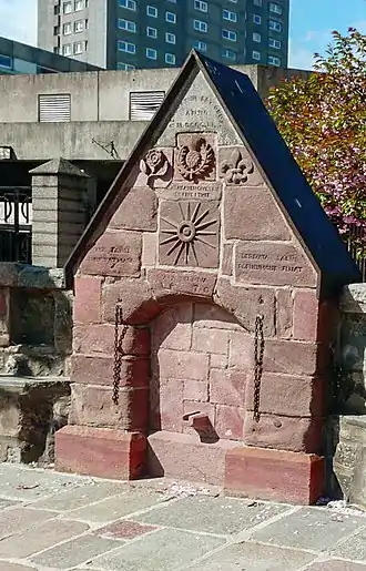 In the fifteenth and sixteenth centuries the well was located adjacent to what was known as the "Playe Green".[7] It now lies in a peaceful square overlooked by a modern car park and an elegant granite building. The well is marked by a red sandstone and granite monument – part of which is from the seventeenth century. It carries the following inscription on its pediment " ..HOC FONTE DERIVATA SALUS; IN PATRIAM POPULUMQUE FLUAT..". This is carved on sandstone blocks. Over time the well has been rebuilt several times and moved to sites within the Woolmanhill area of Aberdeen before reaching its present position. Any water at the site now comes from the mains water supply of the city.