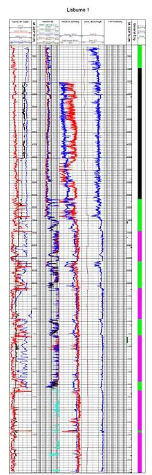 Mud logs are well logs prepared by describing rock or soil cuttings brought to the surface by mud circulating in the borehole. In the oil industry they are usually prepared by a mud logging company contracted by the operating company. One parameter a typical mud log displays is the formation gas (gas units or ppm). "The gas recorder usually is scaled in terms of arbitrary gas units, which are defined differently by the various gas-detector manufactures. In practice, significance is placed only on relative changes in the gas concentrations detected."[34] The current oil industry standard mud log normally includes real-time drilling parameters such as rate of penetration (ROP), lithology, gas hydrocarbons, flow line temperature (temperature of the drilling fluid) and chlorides but may also include mud weight, estimated pore pressure and corrected d-exponent (corrected drilling exponent) for a pressure pack log. Other information that is normally notated on a mud log include directional data (deviation surveys), weight on bit, rotary speed, pump pressure, pump rate, viscosity, drill bit info, casing shoe depths, formation tops, mud pump info, to name just a few.