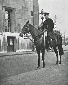 The renovation of Hyde Park, Green Park, and St James's Park began in 1825, with the demarcation of new drives and pathways, subsequent to which Burton designed new lodges and gates, viz. Cumberland Gate, Stanhope Gate, Grosvenor Gate, the Hyde Park Gate/Screen at Hyde Park Corner, and, later, the Prince of Wales's Gate, Knightsbridge, in the classical style.[3] There were no authoritative precedents for such buildings, which required windows and chimney stacks, in the classical style, and, in the words of Guy Williams, "Burton's reticent treatment of the supernumerary features" and of the cast iron gates and railings was "greatly admired".[3]