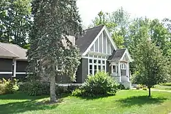 Wells Memorial Library is a historic library building located at Upper Jay, Essex County, New York. It was built in 1907, and is a 1 1/2-story, square, frame building with Tudor Revival and Arts and Crafts design elements. It sits on a stone foundation and has a steep hipped roof with cross gables. It features stucco cladding, half-timbering, and narrow banks of multi-pane windows. An addition to the building was constructed in 2001.[2]