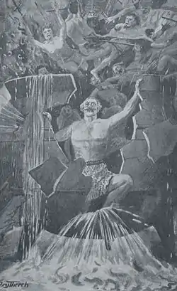 The Spoils of Annwfn is a cryptic early medieval poem of sixty lines found in the Book of Taliesin. The text recounts an expedition to the Otherworld, led by King Arthur, to retrieve a magical cauldron. The speaker relates how he journeyed with Arthur and three boatloads of men into Annwfn, but only seven returned. Annwfn is apparently referred to by several names, including "Mound Fortress," "Four-Peaked Fortress," and "Glass Fortress", though it is possible the poet intended these to be distinct places. Within the Mound Fort's walls Gweir, one of the "Three Exalted Prisoners of Britain" known from the Welsh Triads,[3] is imprisoned in chains. The narrator then describes the cauldron of the Chief of Annwn; it is finished with pearl and will not boil a coward's food. Whatever tragedy ultimately killed all but seven of them is not clearly explained. The poem continues with an excoriation of "little men" and monks, who lack in various forms of knowledge possessed by the poet.