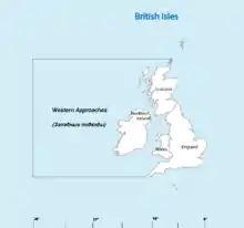 The Western Approaches is an approximately rectangular area of the Atlantic Ocean lying immediately to the west of Ireland and parts of Great Britain. Its north and south boundaries are defined by the corresponding extremities of Britain. The coast of the mainland forms the eastern side and the western boundary is the 30 degree meridian, which passes through Iceland. The area is particularly important to the United Kingdom, because many of its larger shipping ports lie within it.