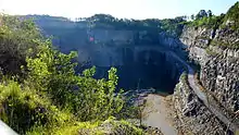 The former granite quarry, which closed in 2007, was a popular hang-out spot for local teens. The site was used as a location for the filming of the AMC's series The Walking Dead in summer 2010. It was also used as a filming location in season four episode 14 of The Vampire Diaries, a scene in Mockingjay Part 1, as well as the final scene of The Fundamentals of Caring. Most recently, (2016) it serves a significant role and is featured prominently in several episodes of the highly acclaimed Netflix series Stranger Things.[6] During construction of the reservoir and the park, the area is closed to the public and trespassers will be arrested. A five-mile tunnel was dug to access water and the reservoir began filling in April 2020.[7]