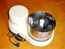 Wet grinding is rare in western cuisine but common in Indian cuisine.[2][3] Wet grinders are used to make pastes from grains and lentils and is used extensively in South Indian cuisine for preparation of popular dishes such as dosa, idly, vada, appam and paniyaram.[4][5][6][7][8][9] It consists of a granite stones which rotate inside a metal drum with the help of an electric motor and the food grains get crushed between the stone and drum.[10] Wet grinders have two advantages over electric mixers or blenders. First, the stone grinder generates less heat than a mixer; heat affects the flavor of the food. Second, the stones remain sharp for a greater time than do metal blades.