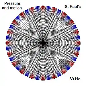 Snapshot of an acoustic whispering-gallery mode calculated at a frequency of 69 Hz in an enclosed cylinder of air of the same diameter (33.7 m)[1] as the whispering gallery in St Paul's Cathedral. Red and blue represent higher and lower air pressures, respectively, and the distortions in the grid lines show the displacements. In the case of the waves travelling one way round the gallery, the air particles move in elliptical trajectories.[2]