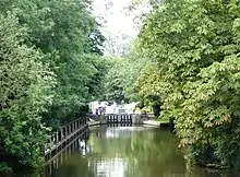 The pound lock, built of oak, was installed at the island in the summer of 1787. Two alternative sites were originally considered. One would have expanded the mill stream on the Whitchurch side, and another would have involved a cut across land occupied by the Swan public house at Pangbourne. A lock house was built on the island in the 1830s. In the later 19th century local people used to cross over the weir to avoid paying tolls on the bridge. The lock was rebuilt in 1876 and access across the weir was closed. The right of way from Whitchurch to the lock was closed in 1888.[3]