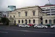 An exhibition hall was built along Whitmore and Stout Streets in 1885.[86][87] Across the road, on part of the Investment House site, was the New Zealand Academy of Fine Arts.[88] Its foundation stone was laid by the Governor, the Earl of Glasgow, in 1892[89] and he opened it on 25 February 1893. There was space for about 400 pictures in its red brick building, which was set back from the street to allow for a decorative entrance.[90] A new front was added in 1916.[91] The gallery was later described as, "a small, modest-looking brick structure, somewhat resembling a spacious bakehouse".[89] It had a corrugated iron roof.[92] From 7 March 1936 its works were moved to the new Dominion Art Gallery on Mount Cook.[93] The 2-storey building was modified in 1939.[94] It was demolished when Investment House was built.[95]
