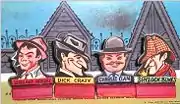 Why can be played by two to four players, aged 12 to adult. The four gamepiece characters are each humorous allusions to detectives of popular media fiction: Sergeant Monday (Sergeant Friday), Dick Crazy (Dick Tracy), Charlie Clam (Charlie Chan), and Shylock Bones (Sherlock Holmes). The six "ghosts" in the game are each based on actual historical figures: Daniel Boone, Pocahontas, Napoleon, Nero, Cleopatra and Henry the Eighth. The weapons in the game are a rope, a gun, poison, and an ax. The motive cards include the "Jealousy," "Lover's Quarrel," "Self Defense," and can be used only in conjunction with Alfred Hitchcock "It's A Mystery To Me" card.