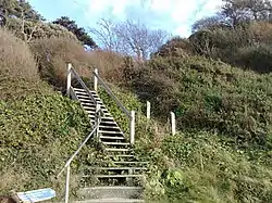 The Isle of Wight Coastal Path passes up the steps of the chine. At the bottom of the chine is the old Totland lifeboat house.
