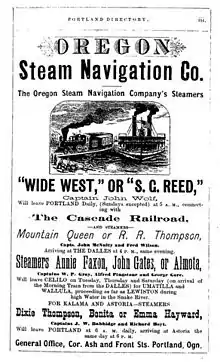 Wide West ran for several years on the Portland-Cascades route, occasionally going to Astoria.[4] Passengers disembarked, and all freight was offloaded at the Cascades, to be taken by a portage railroad around the rapids of the Cascades, to another steamboat, which would proceed to The Dalles, Oregon, where the process would be repeated to bypass the long stretch of rapids above that point on the river.[2][3] When first built, the Daily Astorian criticized O.S.N. for not placing the boat on the Astoria route.