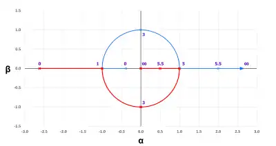 Root locus plot of Wien bridge oscillator pole positions for R1 = R2 = 1 and C1 = C2 =1 versus K = (Rb + Rf)/Rb. The numerical values of K are shown in a purple font. The trajectory of the poles for K=3 is perpendicular to the imaginary (β) axis. For K >> 5, one pole approaches the origin and the other approaches K.[34]
