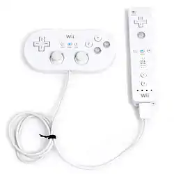 The Classic Controller is an extension for the Wii Remote, released alongside the Wii in November 2006. Its form factor is similar to classic gamepads such as that for the Nintendo 64, with a d-pad, four face buttons, Start and Select buttons alongside the Wii connection button, and two shoulder buttons. Players can use it with older games from the Virtual Console in addition to games designed for the Wii.[101] In 2009, Nintendo released the Wii Classic Controller Pro, which was modelled after the GameCube's form factor and included two analog sticks.[102]