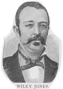 Walter "Wiley" Jones was born in Madison County in northeastern Georgia, on July 14, 1848.[1] His parents were George Jones, a white planter, and Jones' slave, Anne,[2] who had six children by George Jones: Matthew (who superintended the construction of the Wiley Jones Street Car Line), Thomas, Julia (wife of Ben Reed), Wiley, Taylor, and James (who managed many of Wiley's businesses). Wiley received his nickname because of his mischievous nature. At the age of five, he moved to Arkansas with his master and more than forty fellow slaves. They settled on the Governor Byrd plantation. George Jones died in 1858. Anne was called his wife in an 1889 biography of Jones, and she believed that George had promised to free herself and her children upon his death, but no manumission papers were found, and the family was kept as slaves and sold by the estate administrator, Peter Finerty, to James Yell, a lawyer and planter in Pine Bluff. Jones worked as a houseboy and carriage driver for his new master. When Jones was ten, he was given to Yell's only son, Fountain Pitts Yell, on the occasion of Pitts Yell's marriage. Pitts was a state representative from 1860 to 1861. During the American Civil War, James Yell became a Major General of the Arkansas State Militia, and Pitts became a colonel in Company S of the 26th Arkansas Infantry Regiment in the Confederate Army. James Yell's was transferred to the Confederate States Army in the summer of 1861, and James left the service and moved to Texas. Jones served for Pitts during the war until Pitts' death in 1864 at the Battle of Pleasant Hill in Louisiana. Jones then joined James Yell and his family in Waco, Texas. There, he served as a porter in a mercantile house for one year. He was then hired to drive a wagon carrying cotton on a route along the Brazos River to San Antonio.[3]