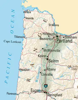 ![]() The Willamette Valley contains most of Oregon's population; it extends from the Portland metro area in the north to Eugene in the south. | |