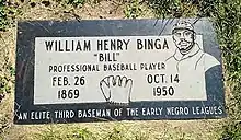 Binga was buried in an unmarked grave in Minneapolis, Minnesota, where his grave remained unmarked for more than 63 years. He received a proper headstone for the first time in June 2014 from the Negro Leagues Baseball Grave Marker Project.[17] His death records show he was married, to Edna Louise, and his parents were Joshua and Lucy Binga.[18] According to the 1940 Census, Binga's wife had died.[19]