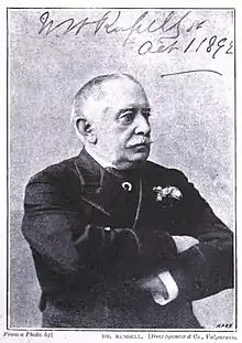 In 1861 Russell went to Washington and returned to England in 1863. In July 1865 he sailed on the Great Eastern to document the laying of the Atlantic Cable and wrote a book about the voyage[7] with colour illustrations by Robert Dudley.[8] He published diaries of his time in India, the American Civil War[9] and the Franco-Prussian War, where he describes the warm welcome given him by English-speaking Prussian generals such as Leonhard Graf von Blumenthal.