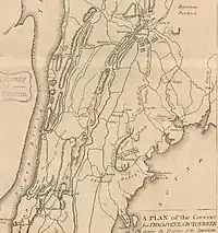 Howe himself wrote to Burgoyne on 17 July that he intended to stay close to Washington: "My intention is for Pennsylvania, where I expect to meet Washington, but if he goes to the northward contrary to my expectations, and you can keep him at bay, be assured I shall soon be after him to relieve you." This suggested that Howe would follow Washington if he went north to assist in the defence of the Hudson.[89] Howe, however, sailed from New York on 23 July.[90] On 30 August, shortly after his arrival at Head of Elk, Howe wrote to Germain that he would be unable to assist Burgoyne, citing a lack of Loyalist support in the Philadelphia area.[91] A small force sent north from New York by General Clinton in early October was also unable to assist Burgoyne.[92]