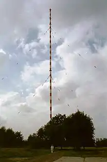 The transmitter Wilsdruff was a medium wave radio broadcasting facility near Wilsdruff, Germany. Until the 1990s there was a transmitter for 1044 kHz with 250 kilowatts transmission power. This was a 153-metre guyed steel tube mast, insulated with respect to ground. Since the mid nineties transmission power was only 20 kilowatts. The new transmitter is in a circular building on which the mast stands. The old transmitter of the fifties is a technical monument. The whole facility is a relic from the Joseph Stalin era with a high fence (double fence with dog track and watchtowers) which is still almost complete.
