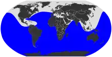 Wilson's storm petrel (Oceanites oceanicus), also known as Wilson's petrel, is a small seabird of the austral storm petrel family Oceanitidae. It is one of the most abundant bird species in the world and has a circumpolar distribution mainly in the seas of the southern hemisphere but extending northwards during the summer of the northern hemisphere. The world population was estimated in 2022 as stable at 8 to 20 million birds.[2] In 2010 it had been estimated at 12-30 million.[3] A 1998 book had estimated more than 50 million pairs.[4] The name commemorates the Scottish-American ornithologist Alexander Wilson. The genus name Oceanites refers to the mythical Oceanids, the three thousand daughters of Tethys. The species name is from Latin oceanus, "ocean".[5]