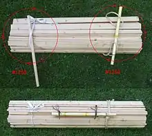 A Spanish windlass is a device for tightening a rope or cable by twisting it using a stick as a lever. The rope or cable is looped around two points so that it is fixed at either end. The stick is inserted into the loop and twisted, tightening the rope and pulling the two points toward each other. It is commonly used to move a heavy object such as a pipe or a post a short distance. It can be an effective device for pulling cars or cattle out of mud.[12] A Spanish windlass is sometimes used to tighten a tourniquet or a straitjacket. A Spanish windlass trap can be used to kill small game. An 1898 report to the US Senate Committee on Foreign Relations about an American vessel captured by a Spanish gunboat described the Spanish windlass as a torture device.[13] One of the captives' wrists were tied together. The captor then twisted a stick in the rope until it tightened and caused the man's wrists to swell.
