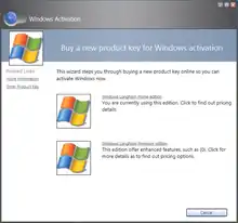 All editions of Windows Vista (excluding Enterprise) are stored on the same retail and OEM optical media—a license key for the edition purchased determines which edition is eligible for installation.[9] When first announced, Anytime Upgrade enabled users to purchase a digital license from an online merchant to upgrade their edition of Windows Vista. Once a license had been purchased, a user's product license, billing and other information would be stored within a user's digital locker at the Windows Marketplace digital distribution platform; this would allow a user to retain this information at an off-site location for reference purposes and to reinstall the operating system, if necessary.[10] A user could then initiate an upgrade to the edition for which the license was purchased either through components stored on the hard drive by the OEM of the personal computer, through an Anytime Upgrade DVD supplied by the OEM, or through retail installation media compatible with Anytime Upgrade.[11] If none of these options were available, Anytime Upgrade provided an option for a user to purchase a DVD online and have it delivered by mail.[2][3]