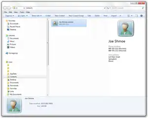 ![]() Contacts folder inside Windows Explorer in Windows 7, showing example contacts. | |