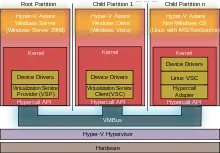 Hyper-V is hypervisor-based virtualization software, forming a core part of Microsoft's virtualization strategy. It virtualizes servers on an operating system's kernel layer. It can be thought of as partitioning a single physical server into multiple small computational partitions. Hyper-V includes the ability to act as a Xen virtualization hypervisor host allowing Xen-enabled guest operating systems to run virtualized.[23] A beta version of Hyper-V shipped with certain x86-64 editions of Windows Server 2008, prior to Microsoft's release of the final version of Hyper-V on 26 June 2008 as a free download. Also, a standalone variant of Hyper-V exists; this variant supports only x86-64 architecture.[24] While the IA-32 editions of Windows Server 2008 cannot run or install Hyper-V, they can run the MMC snap-in for managing Hyper-V.