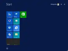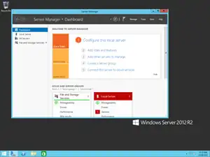 ![]() Screenshot of Windows Server 2012 R2, showing the Server Manager application which is automatically opened when an administrator logs on, start button, taskbar, and the blue color of Aero Lite | |