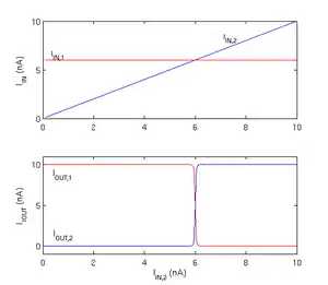 A SPICE-based DC simulation of the CMOS winner-take-all circuit in the two-input case is shown on the right. As shown in the top subplot, the input IIN,1 was fixed at 6nA, while IIN,2 was linearly increased from 0 to 10nA. The bottom subplot shows the two output currents. As expected, the output corresponding to the larger of the two inputs carries the entire bias current (10nA in this case), forcing the other output current nearly to zero.