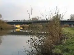 Winterbrook Bridge, also known as Wallingford By-pass Bridge, was built in 1993 as part of a by-pass around Wallingford, Oxfordshire, relieving the single-lane Wallingford Bridge. It forms part of the A4130, connecting Winterbrook, at the north end of Cholsey, just south of Wallingford, on the west bank to Mongewell on the east bank. It crosses the Thames on the reach between Cleeve Lock and Benson Lock. The 55 metres (180 ft), three span bridge is built of steel plate girders with a reinforced concrete deck slab and glass fibre reinforced plastic cladding on the underside.[2]