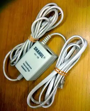 A telephone recording adapter (in-line tap). The phone jack connects to the wall socket while the phone being monitored is connected to the adapter's socket. The audio plug connects to the recording device (computer, tape recorder, etc.).